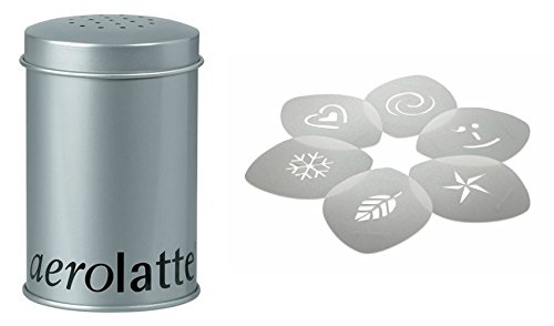 The perfect combination for any cappuccino or latte. An Aerolatte branded shaker tin to give just the right finish of a dusting of chocolate, cinnamon or nutmeg to your cappuccino, hot chocolate or other warm, frothy milk drink. The Aerolatte Cappuccino Art stencils include six stencils, each with a different design. Dust chocolate or other favorite toppings into a fun and novel pattern on your cappuccino, hot chocolate or any milky drink for a fun way to drink coffee. It can also be used with icing sugar for cakes. Set includes one of each design: star, winkey face, heart, leaf, swirl and snowflake. Presented in brushed satin gift tin. Six stencils in tin; measures 3.75 x 3.75 x 0.5-Inch. By Aerolatte.Aerolatte silver tin shaker with cappuccino and latte art stencils
