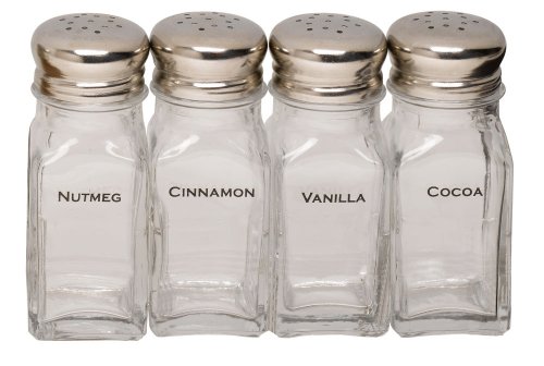 One set includes one each of the following labeled shakers, vanilla, cocoa, cinnamon and nutmeg